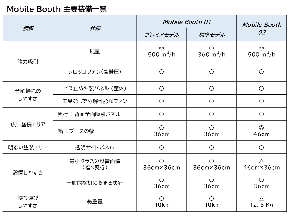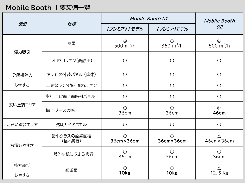 モビルブース02は、常設できる環境を確保できる方に向けて、塗装作業中に「腕が窮屈にならない幅の余裕」を確保したモデルです。