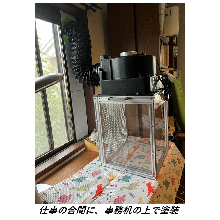常設できる設置スペースがなくても、リビングテーブルや勉強机など普段使っているデスクで使用できる塗装ブースです。使いたいときだけ設置して、使用後はコンパクトに収納して片づけることができます。
