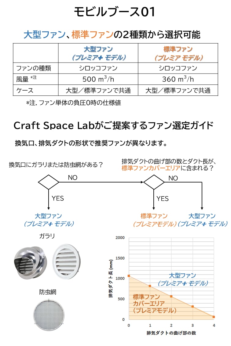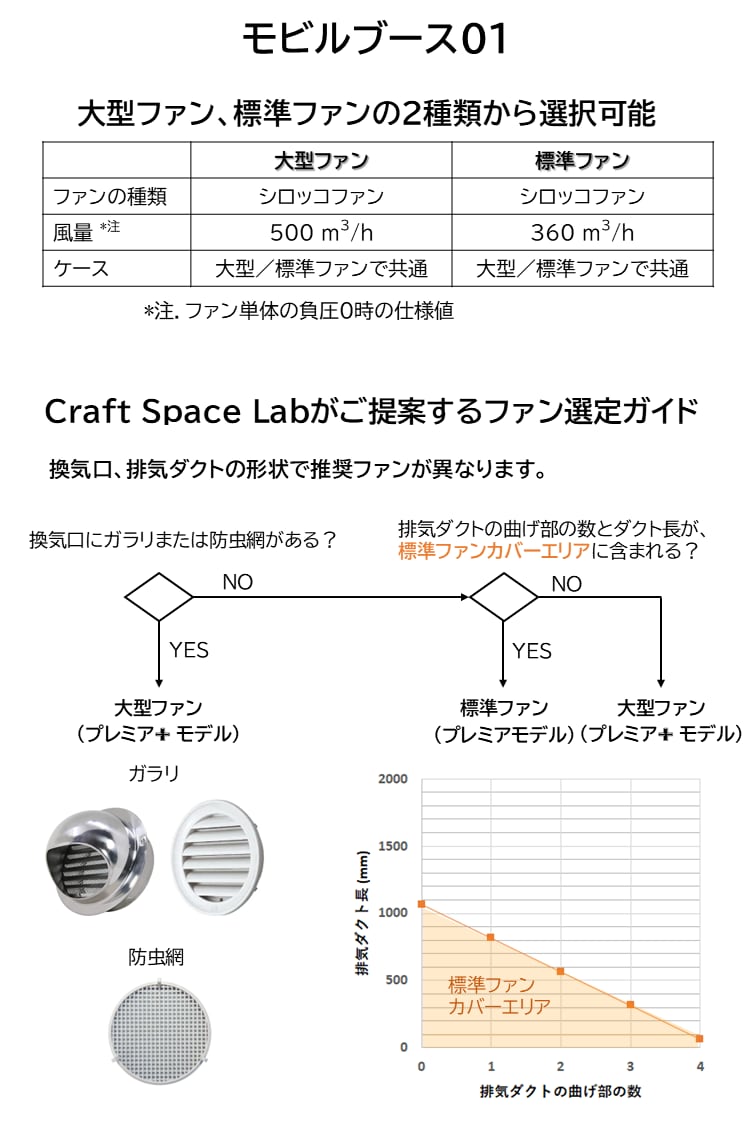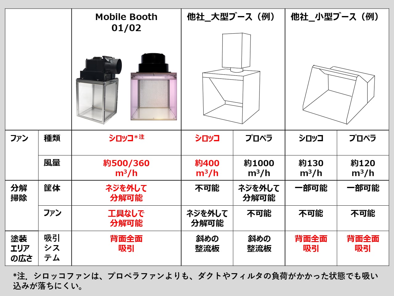 モビルブースは、その条件でも吸い込みが落ちにくいように、大容量の「風量」だけでなく、フィルタやダクトの負荷がかかった状態でも吸い込みが落ちにくい『静圧』が高い「シロッコファン」を採用しています。
