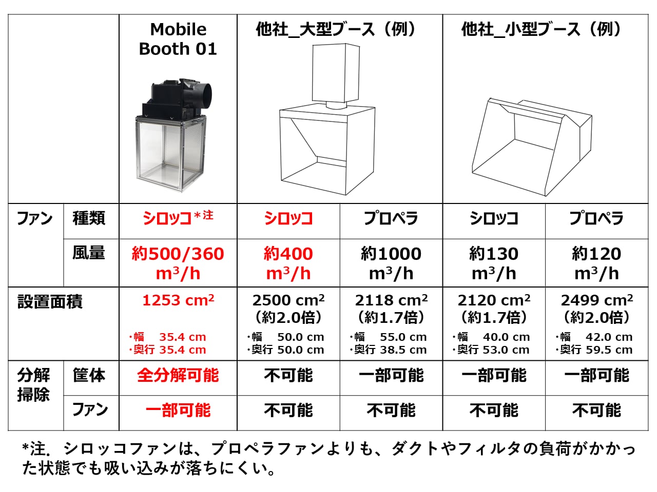 ・缶スプレーから吐出される多量の塗料を吸い込める「大きな風量」、排気ダクトが長く曲がり部があっても排気能力が低下しにくい「高い静圧」を備える強力なシロッコファンを搭載。