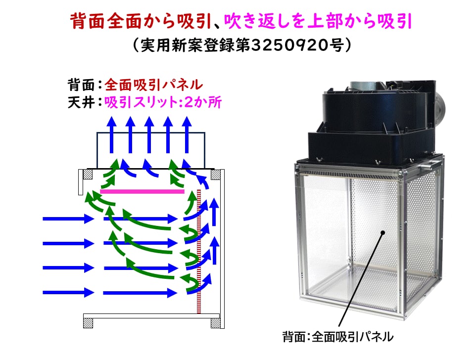 ・カーモデルのボディの様な大きな部品を塗装するときなど「塗料を広い範囲に噴霧」できる様に、塗装エリアの背面全面から塗料と臭気を吸引する背面全面吸引パネルを採用。(実用新案登録第3250920号)