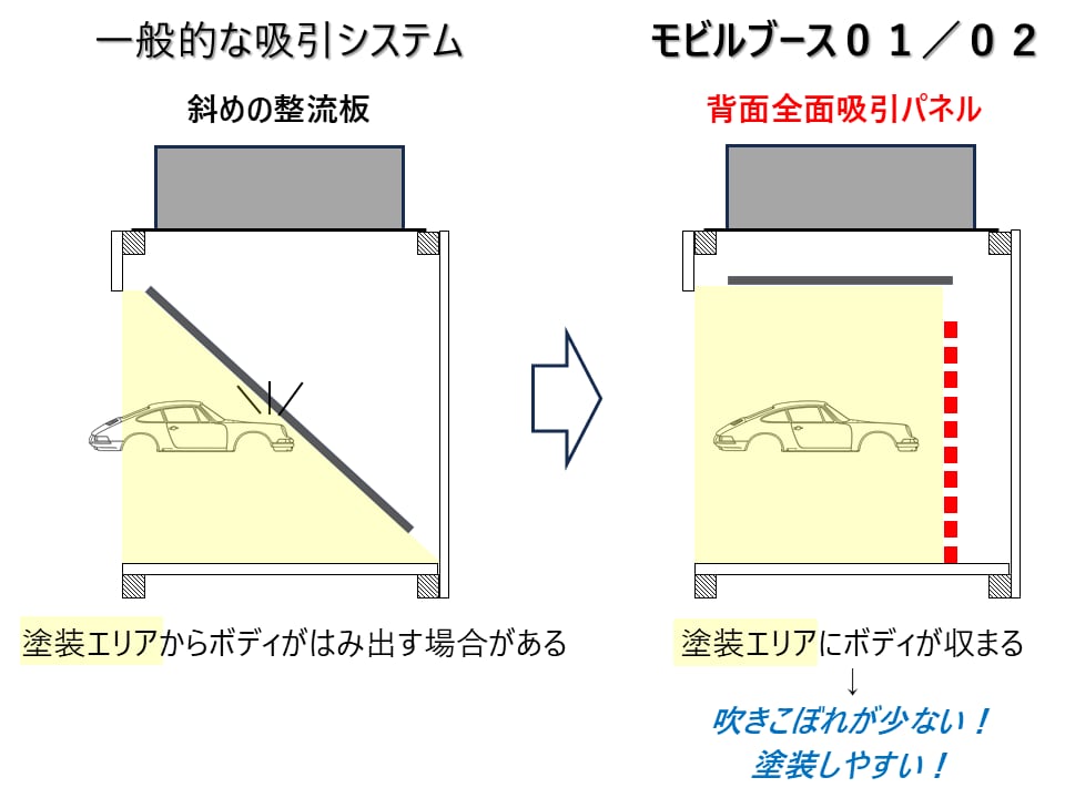 ブース内に斜めの整流板を設けずに、ブース背面全面から吸引する背面全面吸引方式を採用することにより、ブース内の奥行全域を塗装エリアとしました。