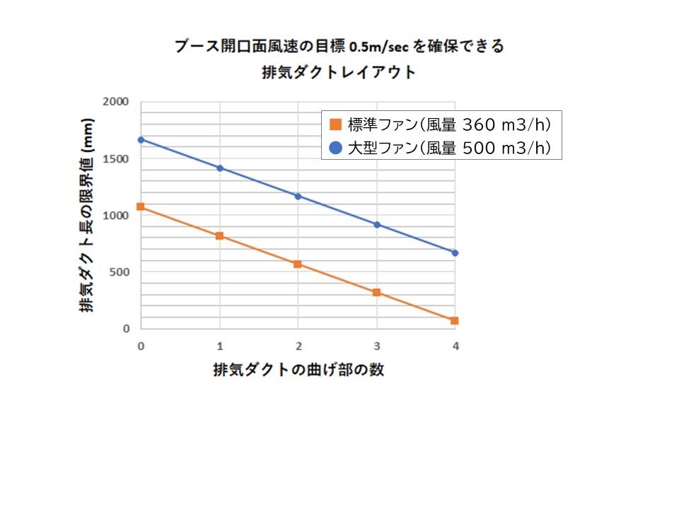 モビルブース01で実際に計測したデータに基づく下記グラフを使って、排気仕様と排気ファンの容量を選択できるようにしていますので、安心してお選びいただけます。